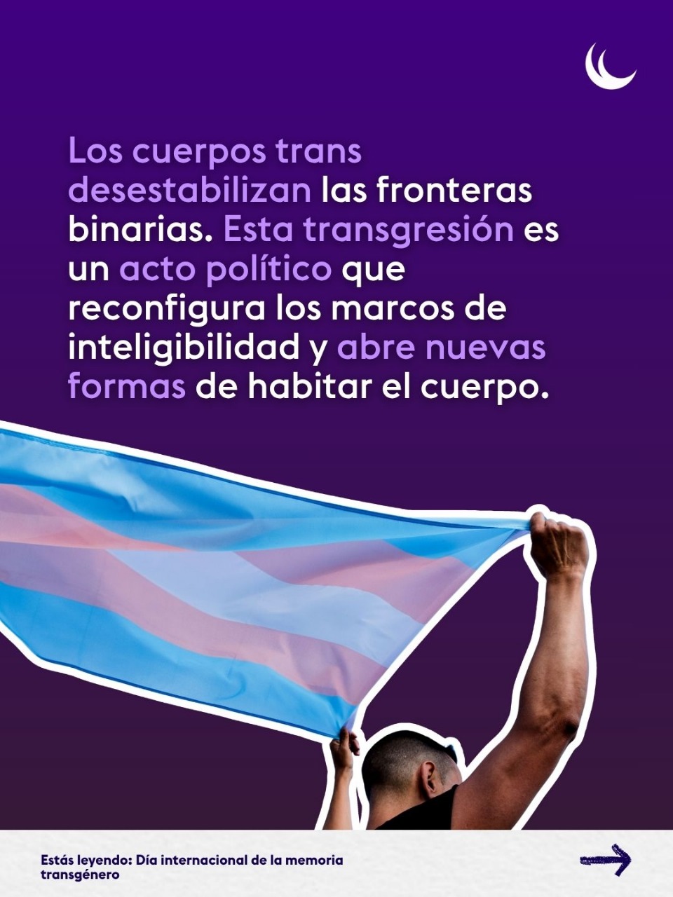 El Día de la Memoria Trans, por tanto, nos interpela a comprender que estos cuerpos no sólo han sido objeto de violencia, sino también articulaciones de transformación, capaces de imaginar y encarnar mundos donde el género no sea un límite, sino un camino abierto a la autodeterminación. En este sentido, la memoria se convierte en un dispositivo político que articula duelo, resistencia y esperanza, y que nos exige actuar frente a las estructuras que continúan produciendo desigualdad y muerte.